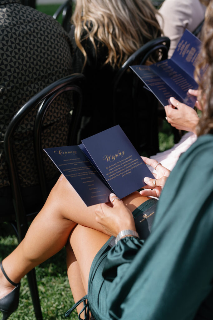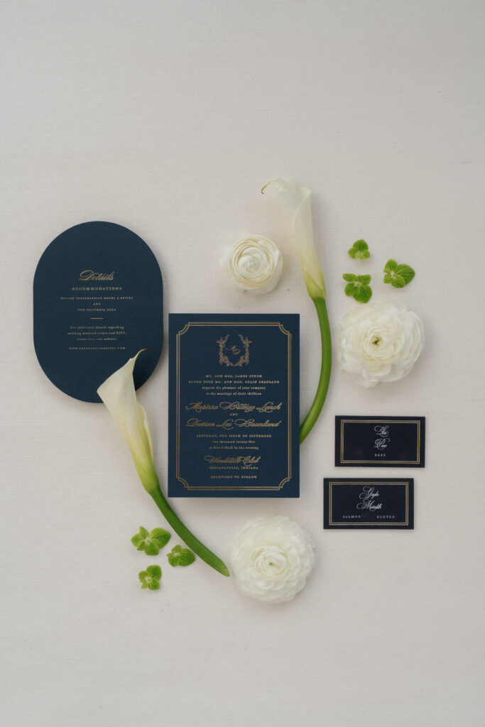 I designed and printed the stationery in deep navy with gold foil accents. I commissioned an artist to create a custom crest with items that represented them as people. The artist sketched Marissa’s dog, a heart and cross joined, the air force symbol for Darren, and a kiwi bird as Darren’s family is from New Zealand. Just because it was a quick turnaround did not mean we wouldn’t pump in the personality that Satin & Stems is known for delivering!