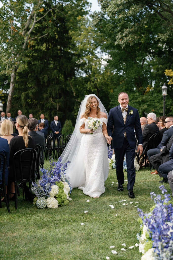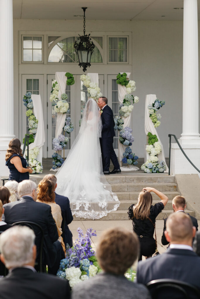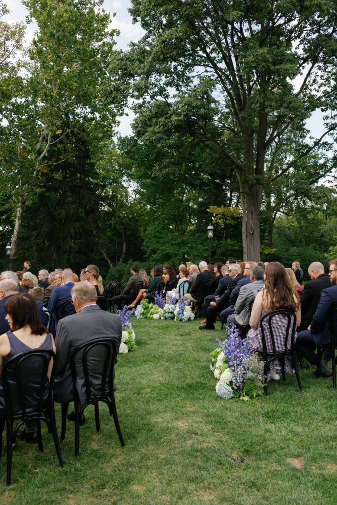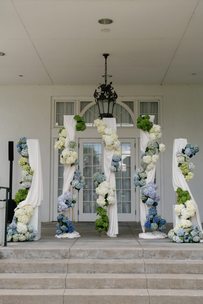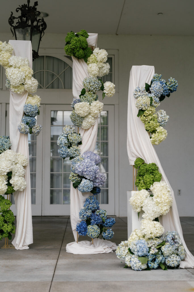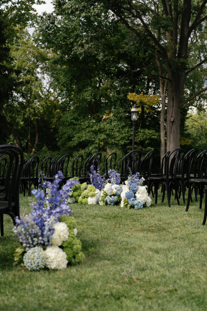 Our bride loved green hydrangeas! I paired a modern floral design with the classic look of this venue by creating sculptural floral art with all of the wedding flowers. I chose to place groupings down the aisle to accent the curves of the aisle. This allowed our wedding party to exit the front door of the house and follow a winding path to the altar. having the curved aisle allowed every guest to be accommodated and gave everyone a good visual of the altar!