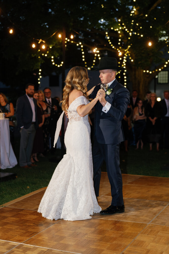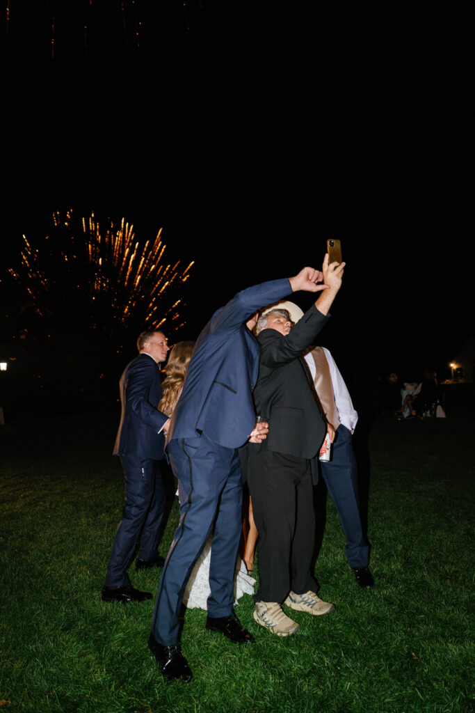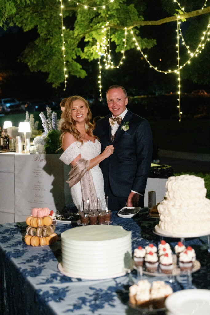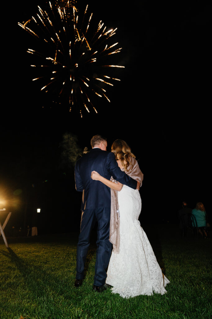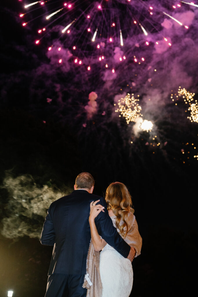 As the sun went down, we created a magical experience outside for everyone to return to. This included a tree filled with twinkle lights, a s’more fire pit, a cornhole tournament (complete with trophies!), a lit dance floor and DJ, a Bourbon Bar and Cigar Lounge, a large dessert table, and the pièce de résistance – an epic professional fireworks show set to some of the couple’s favorite music.