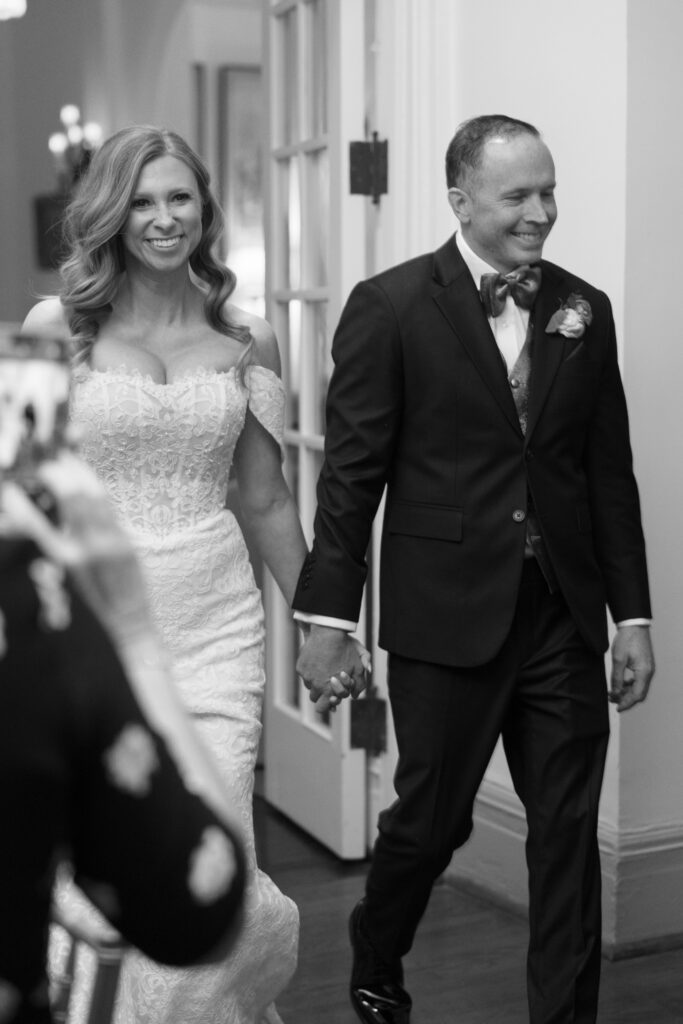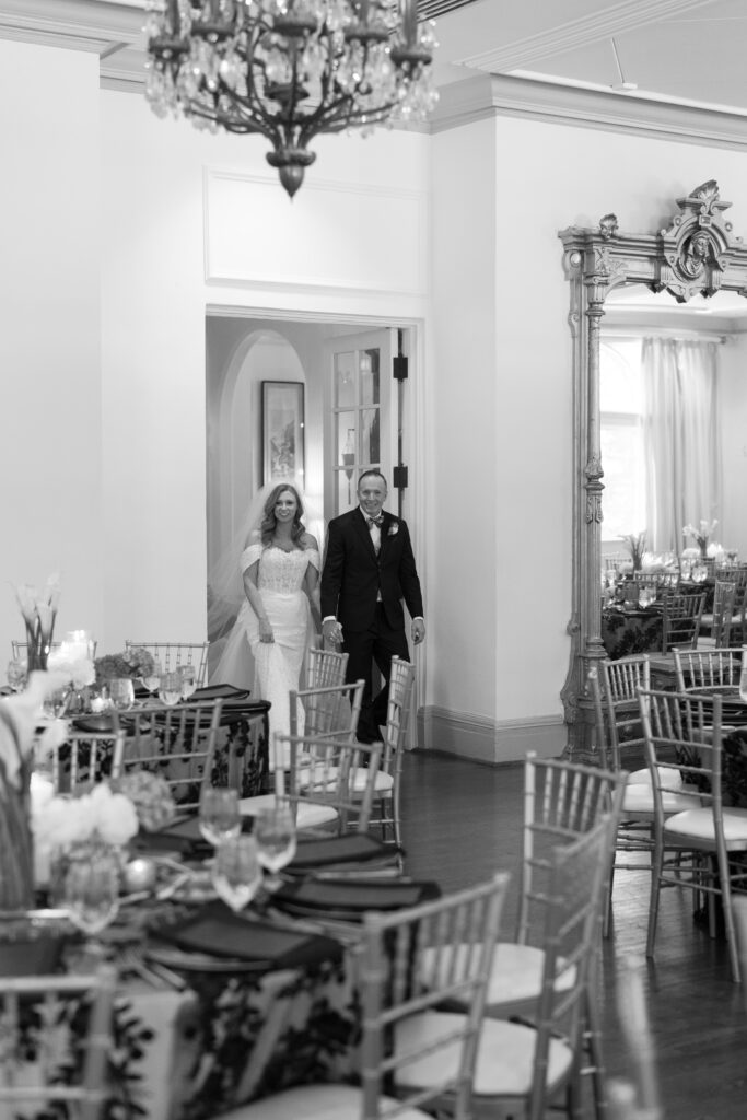 The Woodstock Club is historic here in Indianapolis, and the building is beautiful. However, the couple wanted the wedding reception to be designed in a way that modernized the vibe of the room. They also wanted things to feel a little more masculine since the crown molding and paintings in the room lent to a more feminine feel. Challenge accepted!