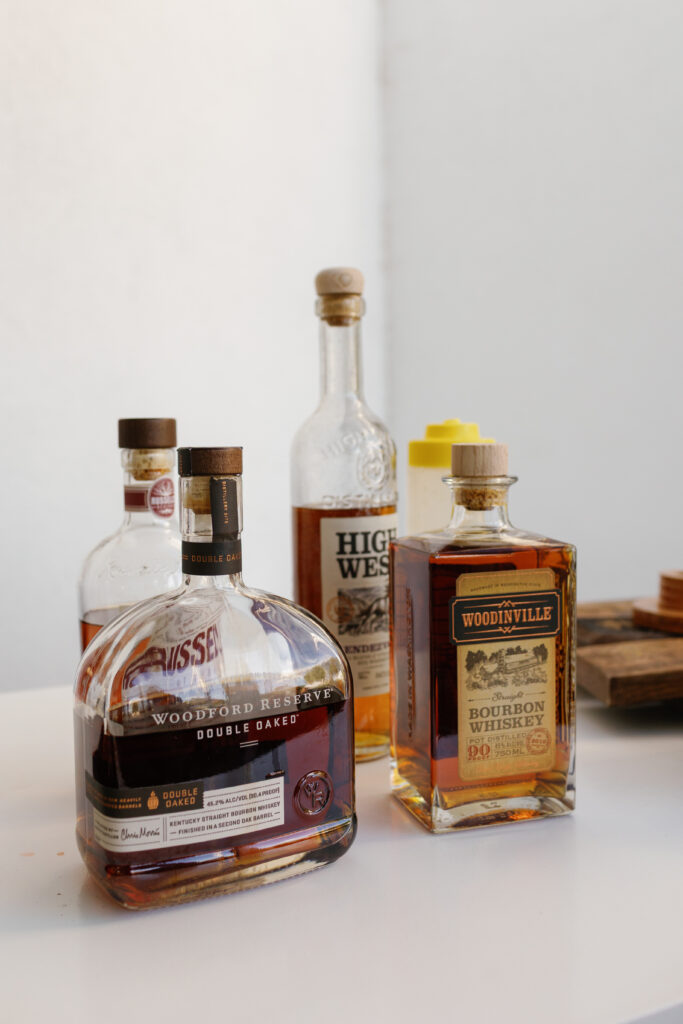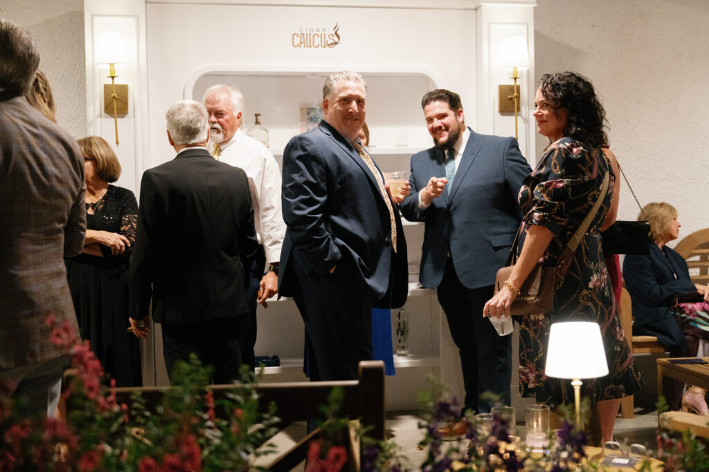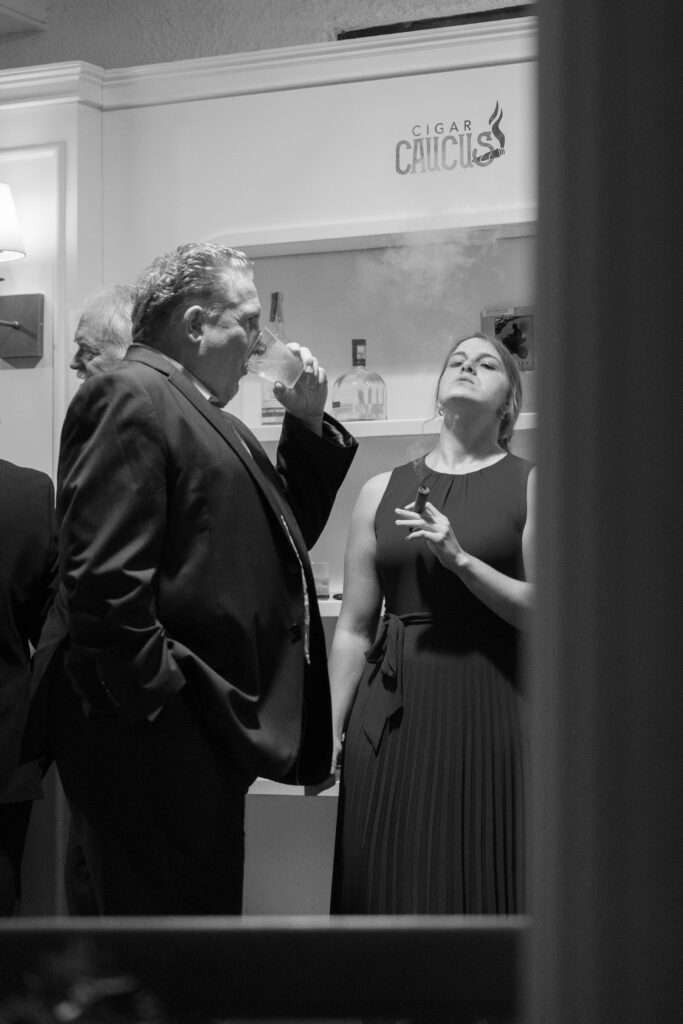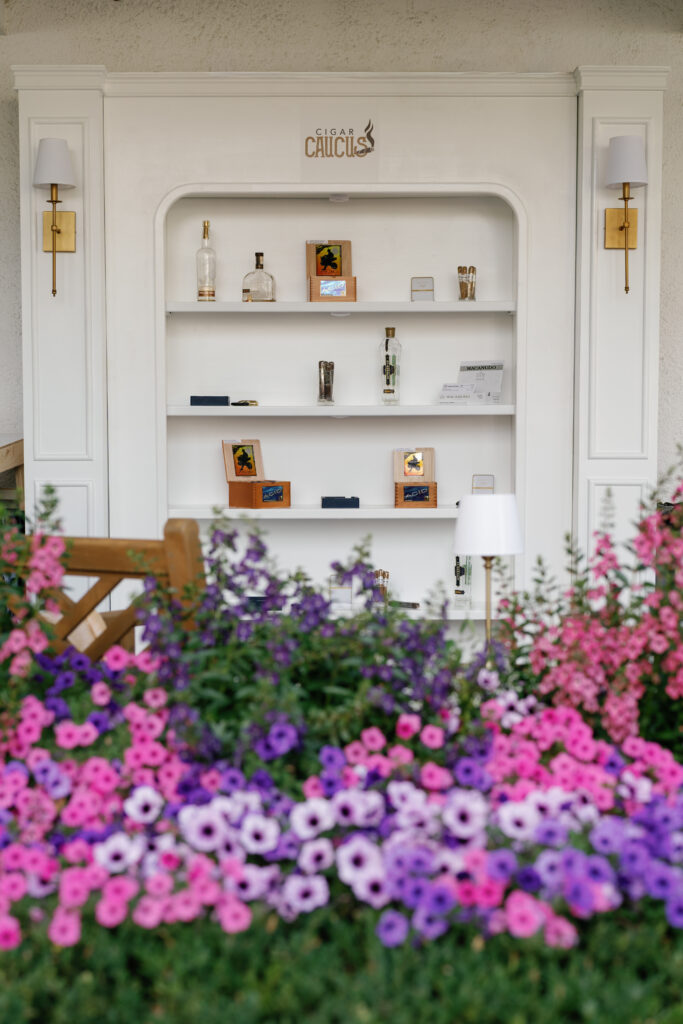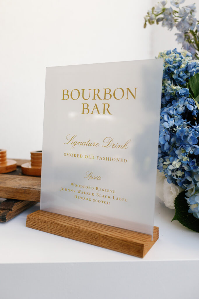 I designed a room under the front porch of the venue to create Marissa’s own lounge for her friends that called themselves “The Cigar Caucus”. A wall of shelves with a graphic created for them held all of their favorite cigars, cutters, ash trays, and some favorite liqueurs. At the end of the “porch”, I made sure to include a tailored Bourbon Bar for the cigar lounge that served individually smoked Old Fashioned cocktails. It was a full room all night!