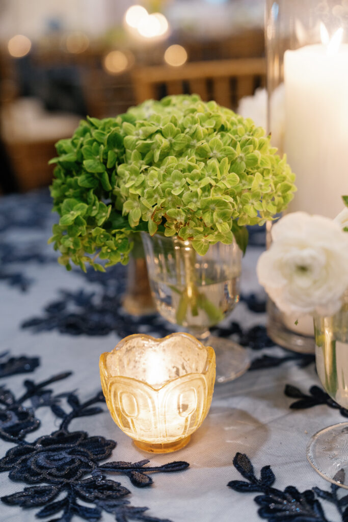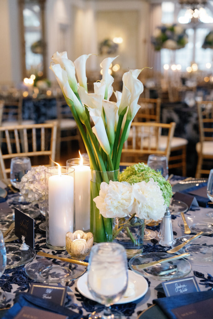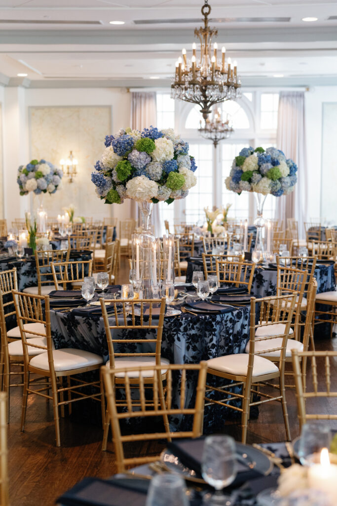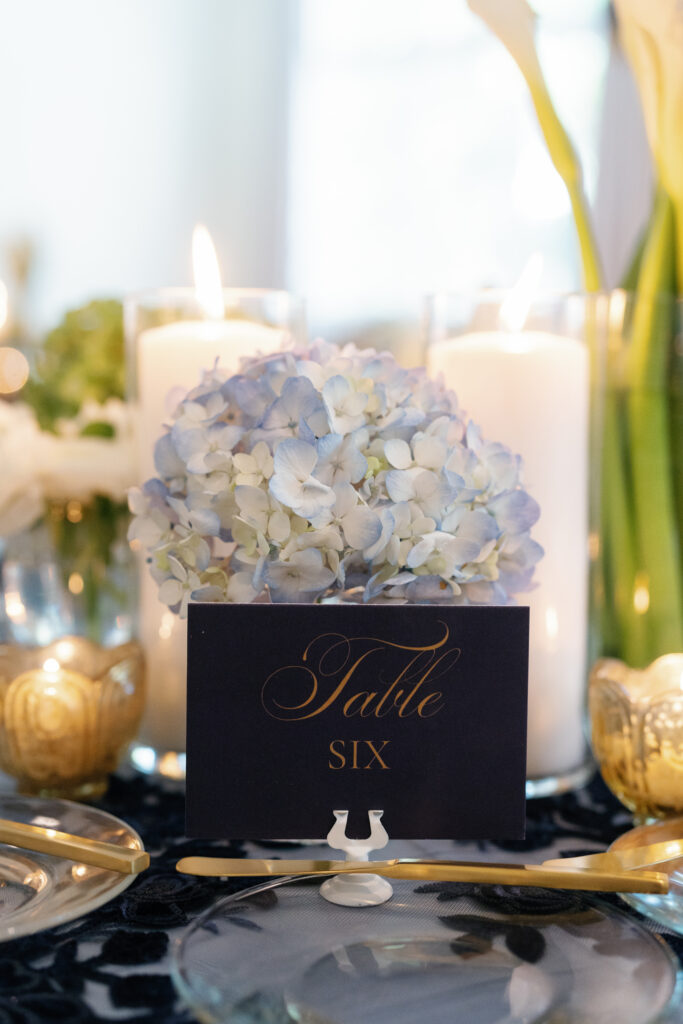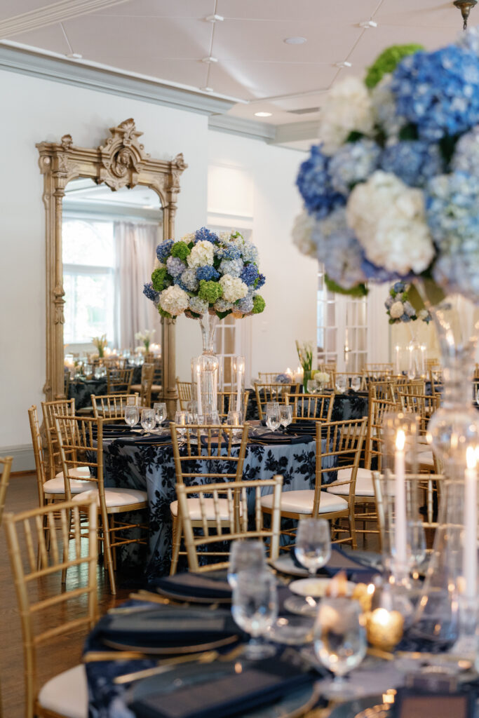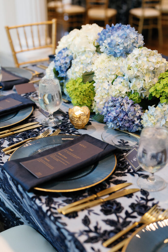 Dark blue and gold were the primary colors I used to bring in that masculinity, and then I softened it by using a slightly-sparkly overlay with monochromatic details. Underneath the see-through overlay, I put a light blue satin tablecloth which created the perfect shade of blue to compliment our flowers.